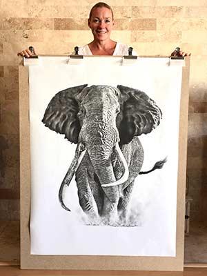 “I strive to push the limits of realism using both charcoal and graphite. I love these mediums for the drama and contrast I am able to create. For me it is important to feel constantly challenged. My aim is to capture the subject in an immersive, close-up way so that one is able to stare into the soul of that person/animal. I believe the emotional connection is so much greater that way.