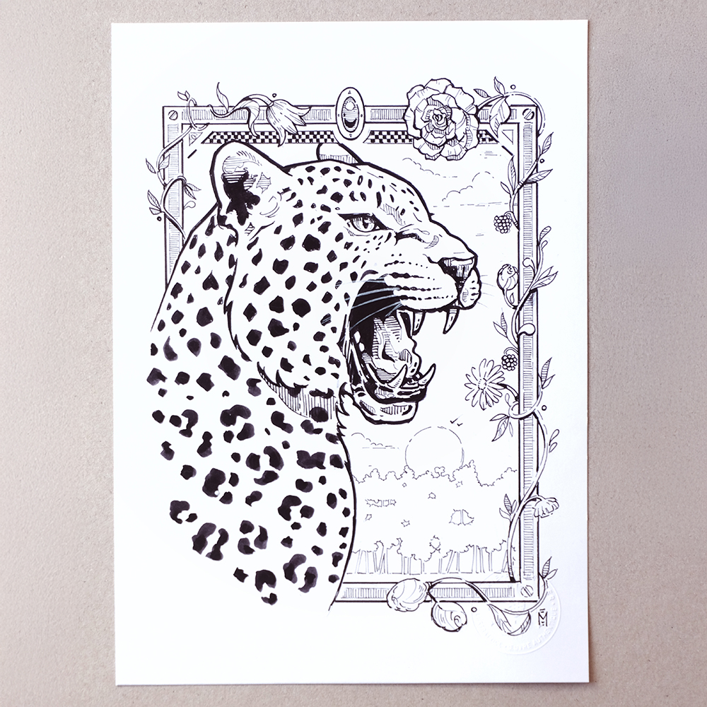 Her work draws deeply from nature. Animals, plant life, organic textures and motifs inspired by the living world run through each of her creations. While she explores a wide range of techniques, from traditional drawing to digital media, as well as painting and tattooing, she always returns to what has inspired her since childhood: monochrome ink drawing, a medium that allows her to play with light, contrast and the finesse of line.